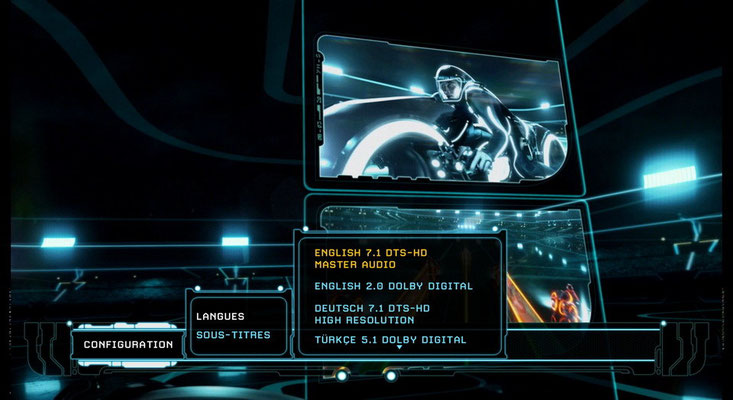 A partir du menu Configuration : Langues, 5 pistes sonores sont disponibles : Anglais 7.1 DTS-HD Master Audio, Anglais 2.0. Dolby Digital, Allemand 7.1. DTS-HD, Turque 7.1.Dolby Digital Plus, et le français en 7.1 DTS-HD Haute résolution.